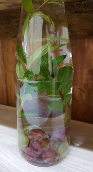 Esses dias usei na minha água, 1 ramo de hortelã, 1 ramo de cidró e uvas. Você pode fazer com alecrim e canela, rodelas de laranja, cravo e hortelã, morango, uvas e limão… Use a criatividade!